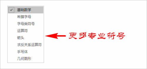 除了根本数学符号之外,我们可以点击根本数学右侧的折叠按钮,打开更多其他专业符号,好比“希腊字母、箭头、运算符”等符号。