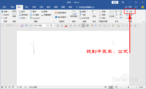 点击插入菜单,在其子菜单中,找到“符号”栏目选项,然后在里面找到“公式”选项功能,点击睁开其子菜单。