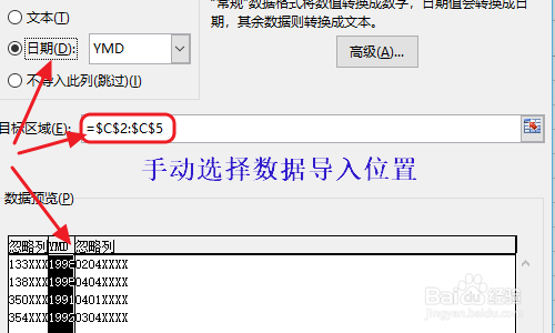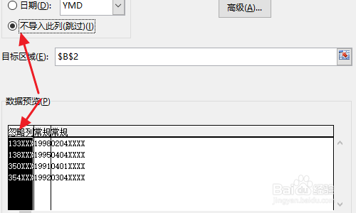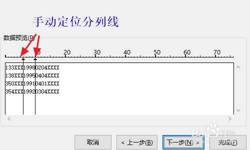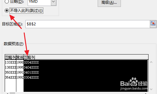 点击下一步今后,我们在标的目的导的第2步,手动定位排列线,将员工的身世年份这四个数和其他数字朋分开来,见下图一;然后把其余不需要的数字别离选中勾选“不导入此列”;