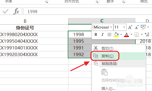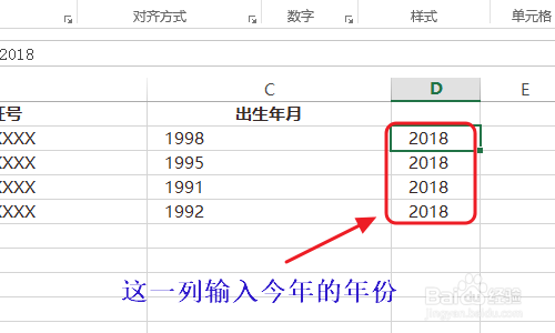 在这一列的后面我们对应的全数输入2018,也就是本年的年份,然后复制C列中所有的数据(也就是适才导出的员工年份那一列);