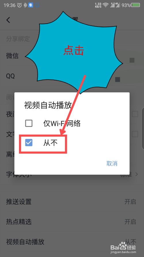 设置从不主动播放后,在视频界面看视频就不会主动播放了。