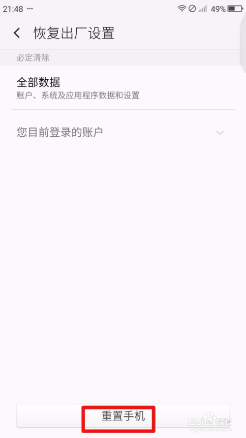 最后,进入到【恢复出厂设置】的界面之后,点击页面底端的【重置手机】按钮,按照提醒操作恢复到手机原始状况就可以了。如图所示