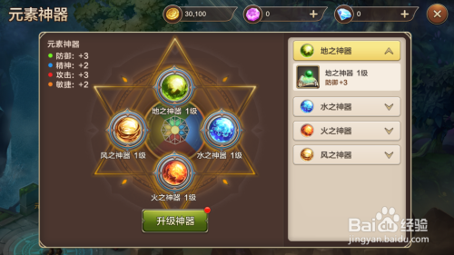 完当作一层之后就会进入到下一层,依次会获得响应的元素神器,点击右侧界面的元素神器选项,就会进入到元素神器进级的界面,这里可以看到对应元素的神器代表的人物根本属性。
