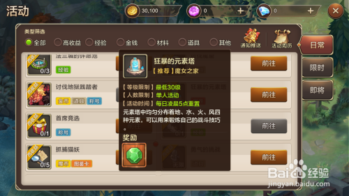 接着就会主动前去狞恶的元素塔npc处,点击对应的npc,然后点击该活动名称,接着进入即可。