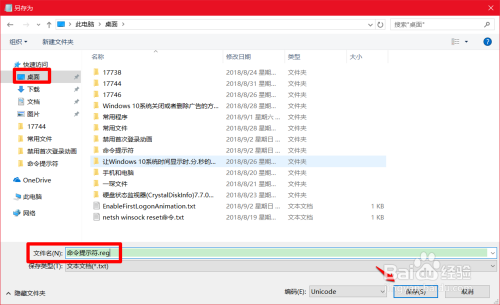 在另存为窗口,先点击窗口左侧的【桌面】,在文件名(N)栏中输入:号令提醒符.reg,再点击:保留;