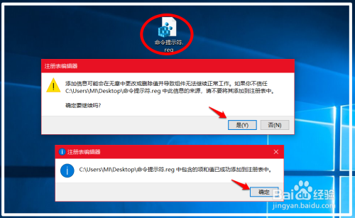 在系统桌面上找到并左键双击【号令提醒符.reg】注册表文件图标,在先后弹出的注册表编纂器对话框中点击:是(Y)和确定;