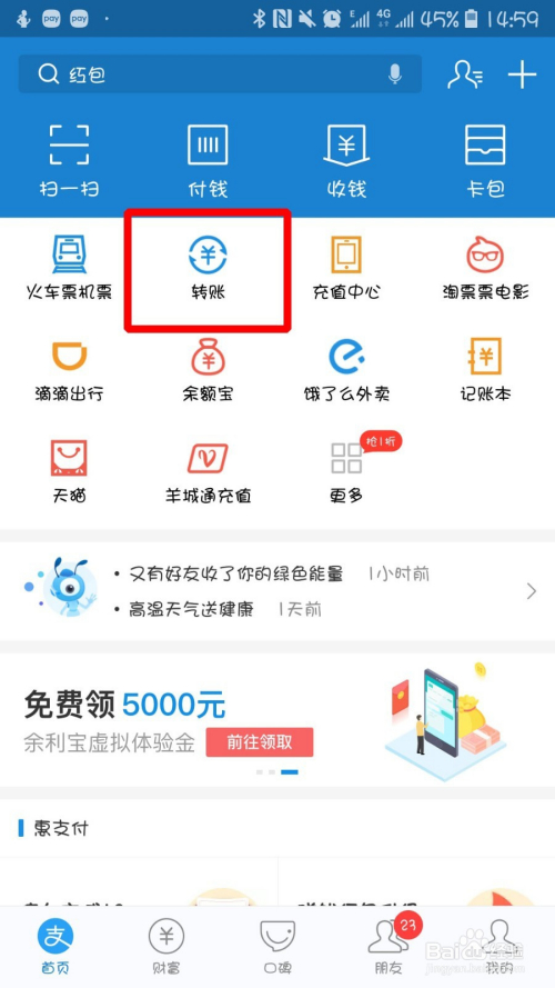 登录付出宝账号,来到付出宝首页,我们点击【转账】