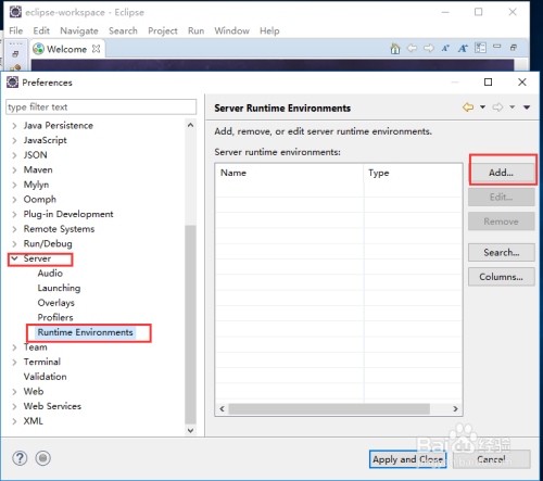 设置tomcat,依次点击菜单栏Window->Preferences,在打开的窗口中找到Server,睁开,点击Runtime Environments,如下图所示: