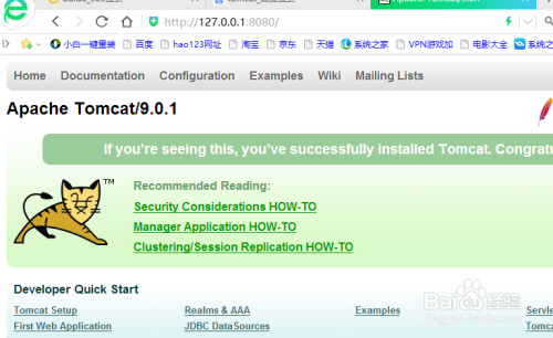 默认安装好tomcat9.0.1后,会提醒启动tomcat,启动今后,去网页打开地址:http://127.0.0.1:8080/,显示如下图,暗示tomcat安装当作功。