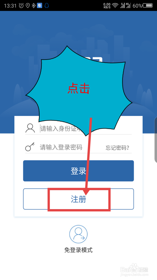 打开登录页面后,点击登录下面的注册选项。如图所示