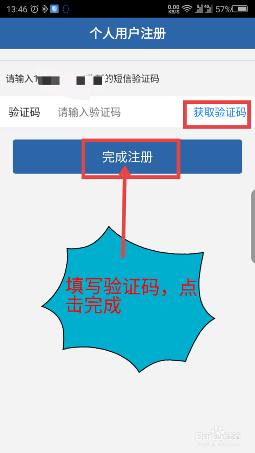 在打开的新页面,点击获取验证码,填写后点击完当作注册。如图所示