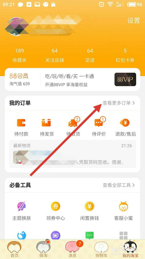进入我的淘宝页面后,点击“查看更多订单”