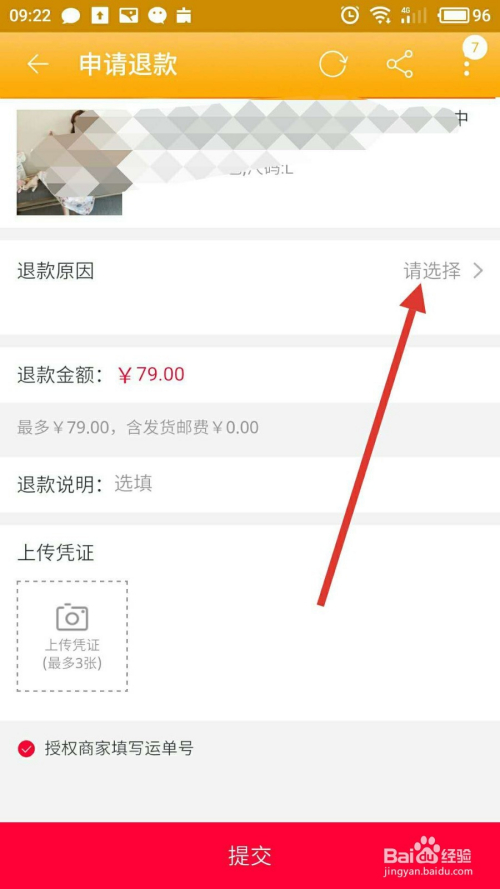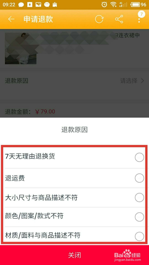 选择一个合适的退条目原因,若是是本身不喜好的话,一般都是选择“7天无来由退货”