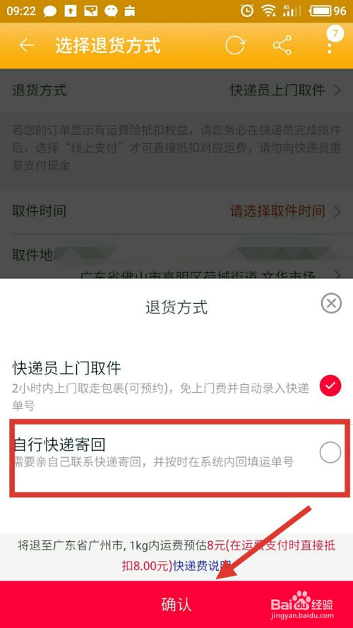 选择一个合适的退货体例,小编一般是选择“自行快递寄回”,然后点击“确认”