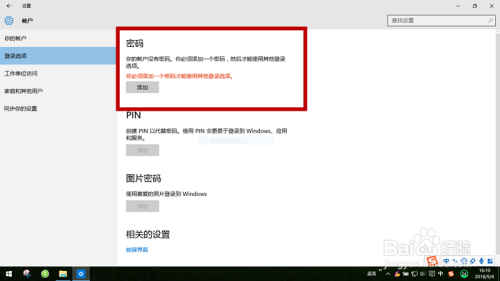 第四,左侧会呈现一排项目,点击:登录选项。右侧会呈现:密码。而且有红色字提醒。你必需添加一个密码才能登岸其它选项。