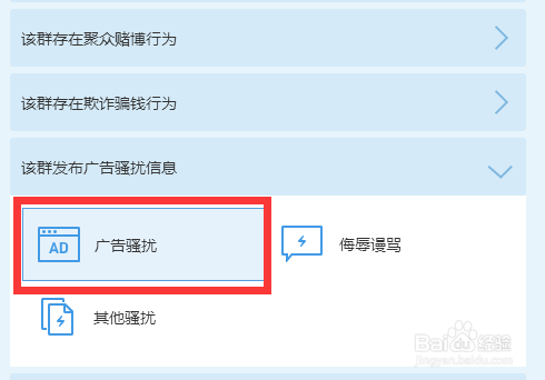 点击【该群发布告白骚扰信息】后,会出来具体的类别,按照现实环境选择类别,好比我选择的是【告白骚扰】。
