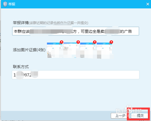 点击告白骚扰后,会出来一个举报详情页面,本家儿要填写举报的来由,上传四张证据,例如说截四张群里发告白的图上传等等,然后留下本身的手机号,便利工作人员核实后和您联系。填写完信息后点击右下角【提交】,提交信息。
