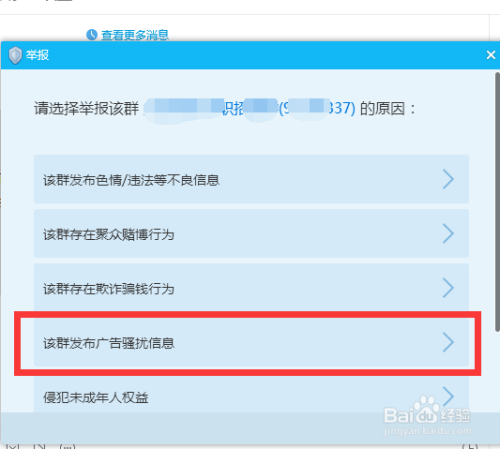 点击举报后,会出来举报详情页面,下边有几种举报来由供大师选择,我的举报来由是群里骚扰告白太多,遇是我点击【该群发布告白骚扰信息】如图所示。