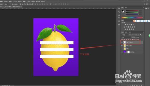将柠檬图层选中,按快捷键Ctrl+J复制一层,获得一个柠檬素材的复制拷贝层,然后将本来的柠檬图层埋没;选中矩形东西,然后在柠檬上面绘制一个长条矩形出来,设置矩形的填充颜色为变色,描边为无;然后选中这个矩形,按住辅助键shift+alt键在复制出两个长条矩形出来。