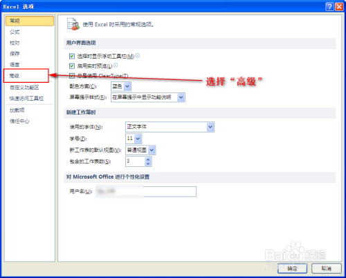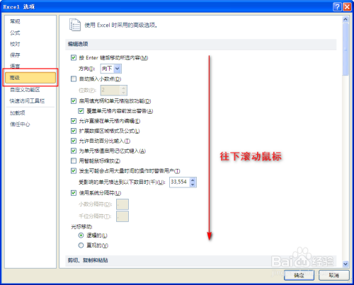 2、在弹出的对话框中选择”高级“,然后在右侧的编纂选项中找到”显示“(往下滚动鼠标)。如图所示: