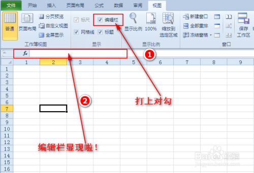 1、打开Excel表格,选择”视图“菜单,在扩展栏中找到”编纂栏“。如图所示: