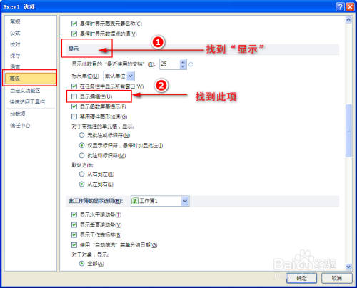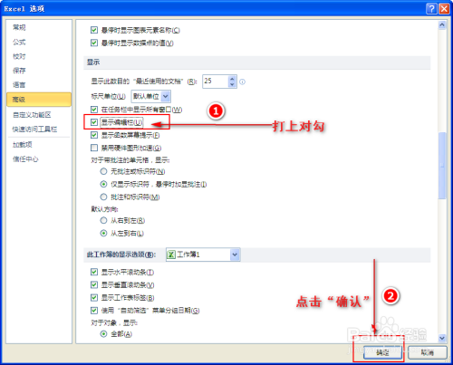 3、找到”显示“后,我们会发此刻”显示“下方就有”显示编纂栏“这一项,然后我们在此项前面的小方框内打上对勾并点击”确认“,如许表格的编纂栏就出来啦!