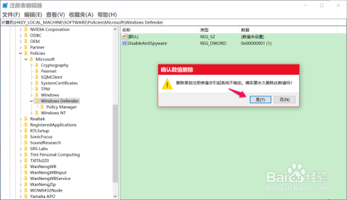 解决方式:进入注册表编纂器中,删除 DisableAntiSpyware 键项。