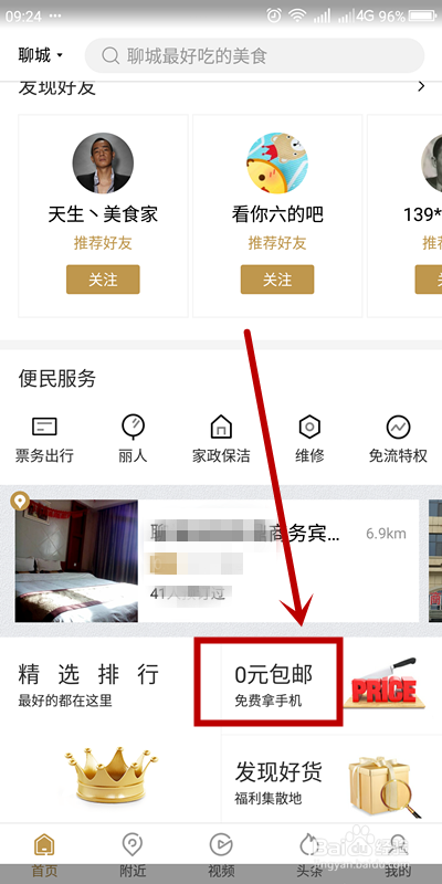 在糯米首页下滑,,找到“0元包邮”,我们单击