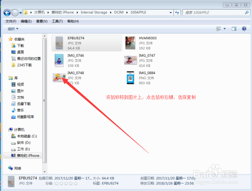 找到手机里的图片,将鼠标移到图片上面,点击鼠标右键,选择复制,然后将图片粘贴到桌面上就可以了。