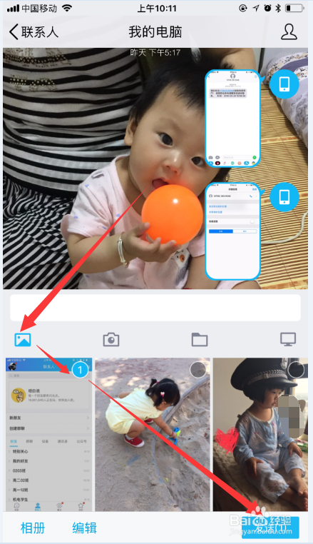 点击左下角的相片图标,勾选需要上传到电脑上的图片,然后点击“发送”。