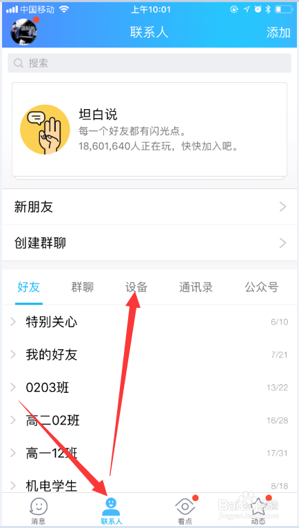同时在电脑和手机上登录QQ,然后在手机QQ的“联系人”界面点击“设备”,鄙人拉菜单中选择“我的电脑”。