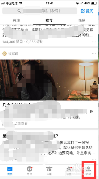 登录知乎后,点击页面右下角【我的】如图所示,进入我的本家儿页。