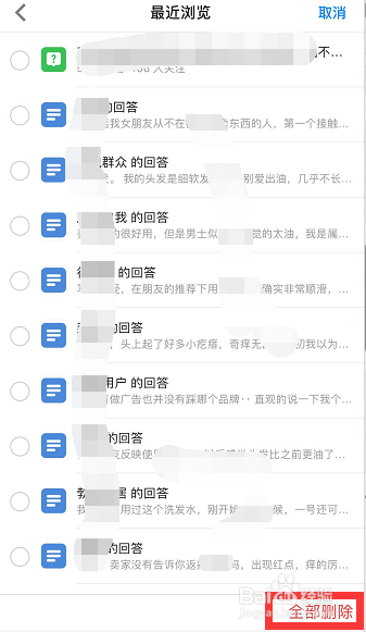 点击批量删除后,可以选择性删除某些浏览内容,也可以一次性全数删除。我这里想要一次性全数删除浏览记实,于是点击右下家红色的【全数删除】。