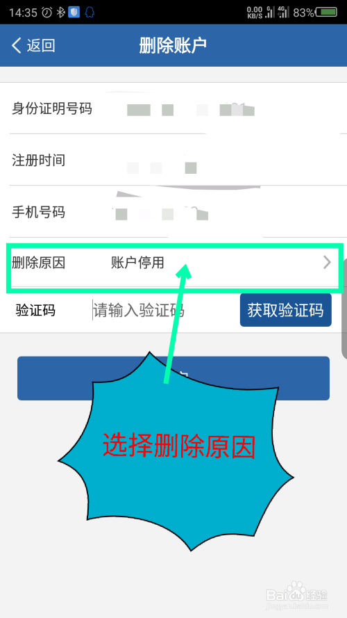 在删除账户界面,先选择删除原因。如图所示