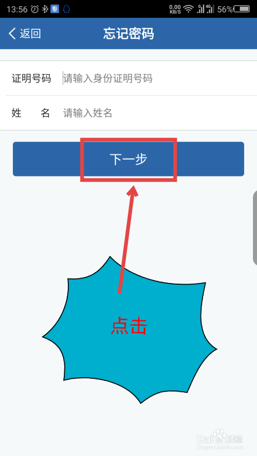 在健忘密码界面,输入小我身份信息,点击下一步。如图所示