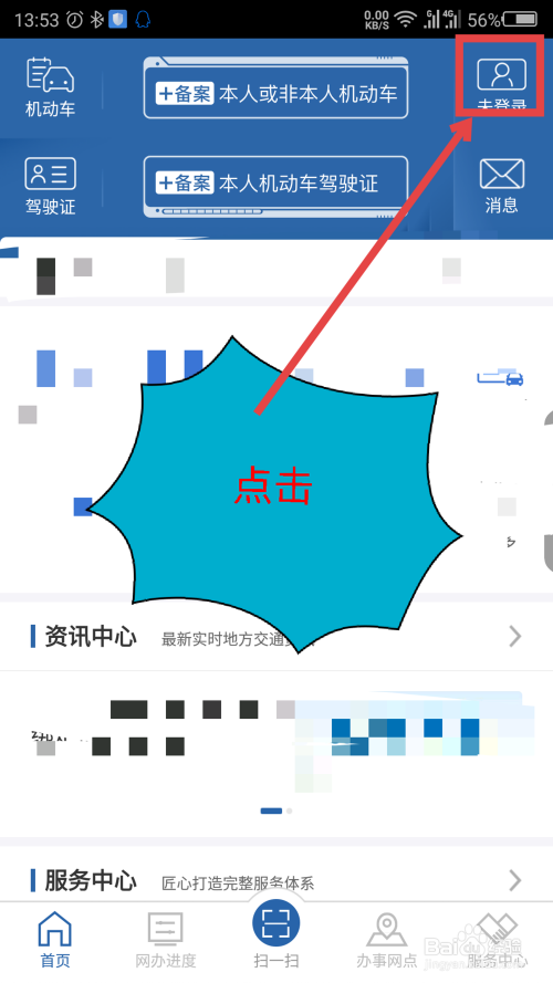 在交管首页界面,点击右上角的未登录选项。如图所示