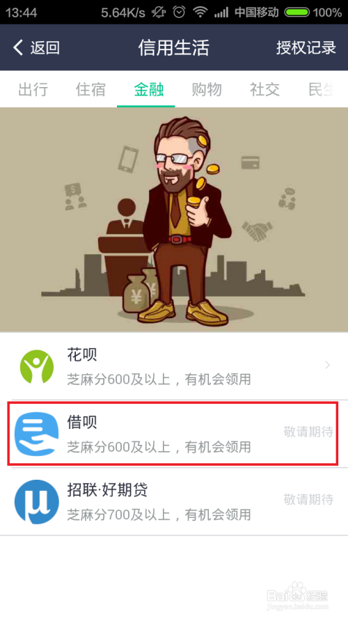 在金融页面中,我们可以看到“借呗”的菜单,上面显示敬请等候,并注明芝麻信用分600分以上可以介入体验,若是你的芝麻信用分已经达到了600分,那么恭喜你不久今后你就可以体验借呗办事啦。