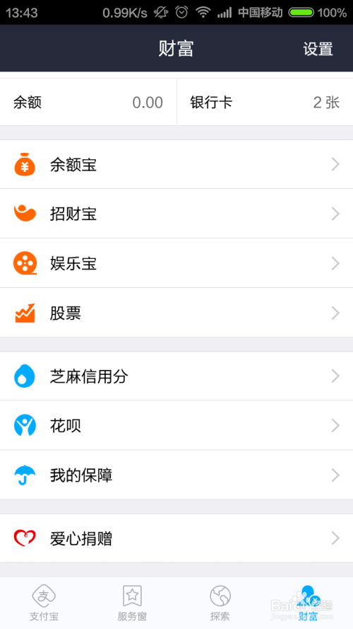 进入付出宝钱包应用软件之后,点击页面最下方的“财富”选项卡,进入付出宝小我中间。