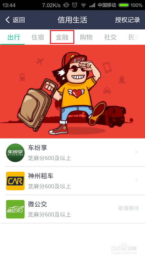 进入信用糊口菜单项目今后,点击页面中的“金融”菜单项目,进入金融页面。