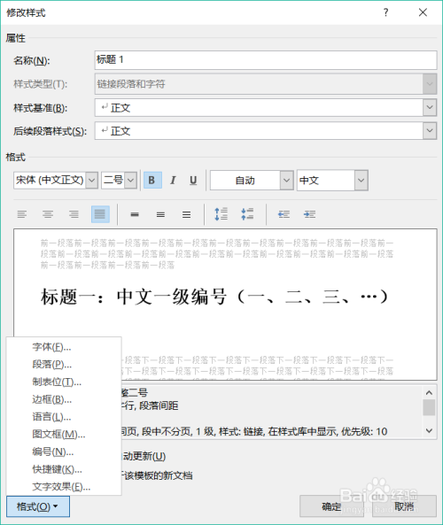 b、选择将级别链接到样式为“题目1”
