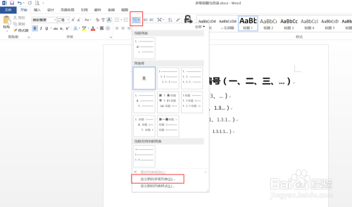 点击起头工作栏段落里的“多级列表”,选择“界说新多级列表”
