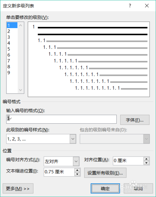 点击“界说新多级列表”中的“更多”