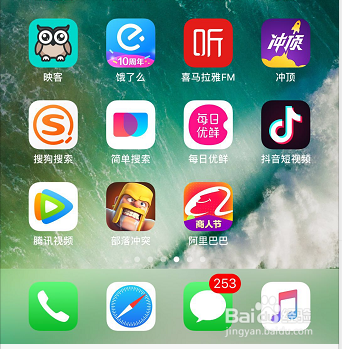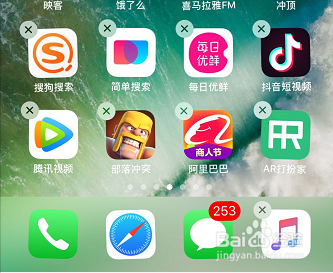 打开手机,找到想要删除的APP图标,长按此图标,待所有APP图标起头晃悠且所有APP左上角呈现如图所示带×的小圆圈后松开手指。