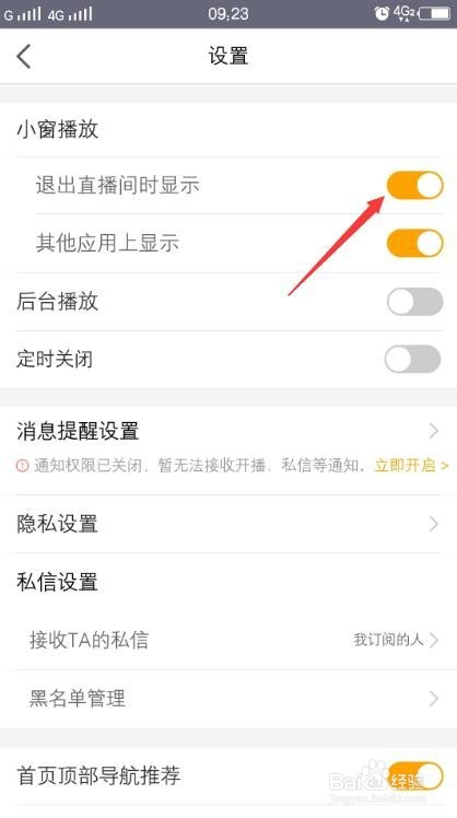 设置中小窗播放,此中将推出直播间时显示开启状况将其封闭。