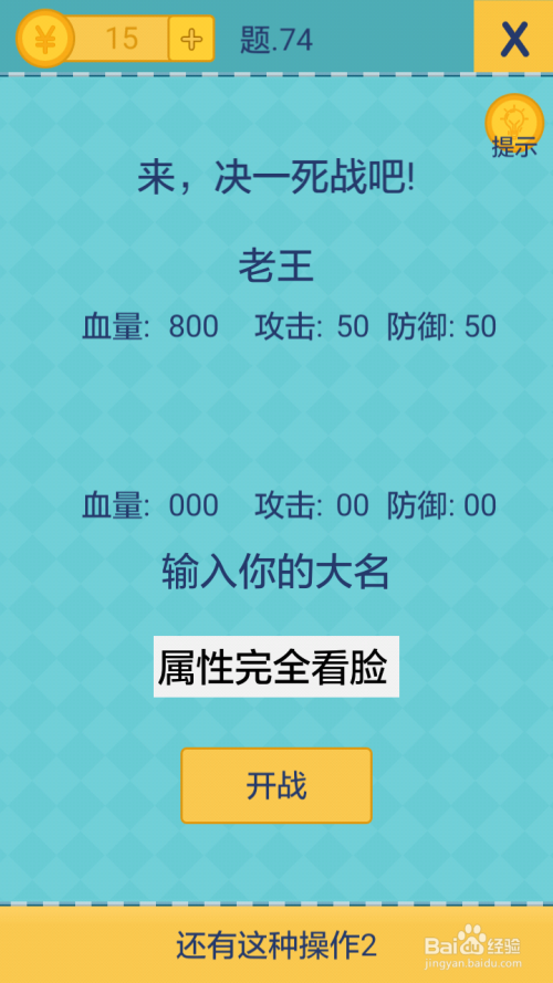 第74关输入属性完全看脸,然后点击开战,等老王血量耗损完就过关了。