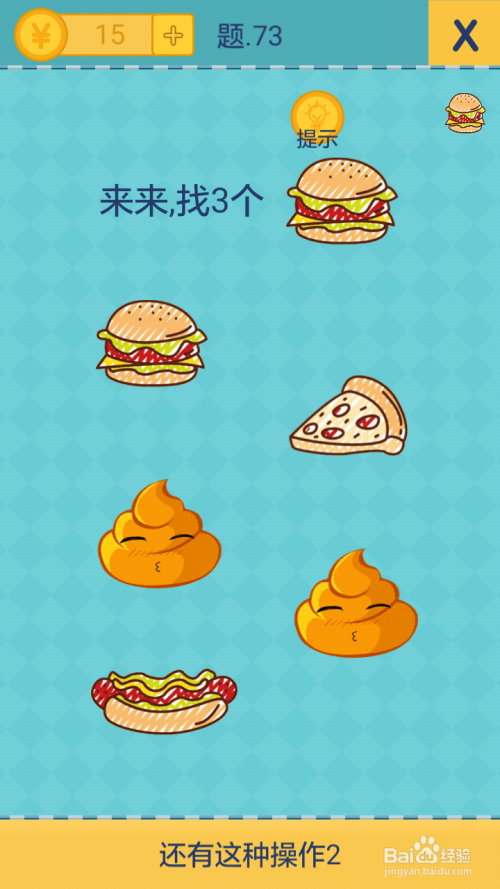 第73关拖动提醒,然后点击3个汉堡就过关了。