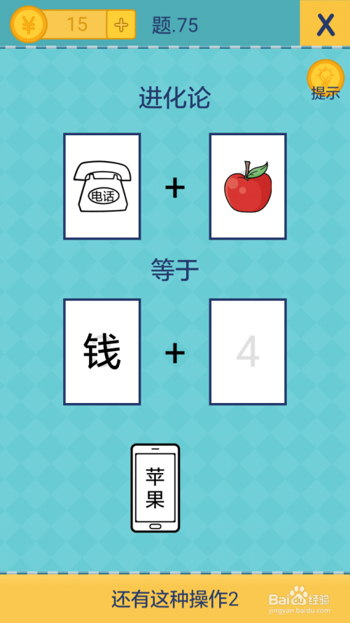 第75关把德律风放在1号框里,苹果放在2号框里,钱放在3号框里,苹果手机放在4号框里就过关了。