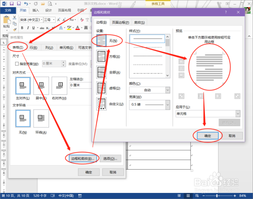 在弹出来的【表格属性】对话框中点击【边框和底纹】,在弹出来的【边框和底纹】中选择“无边框”设置,点击确定。