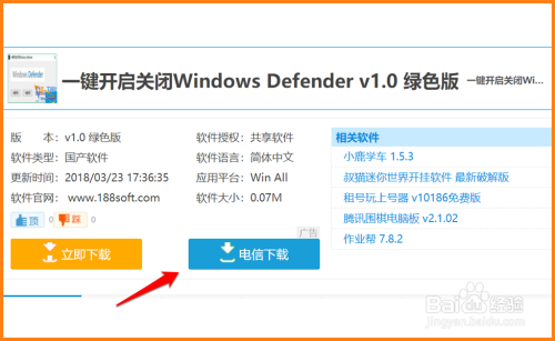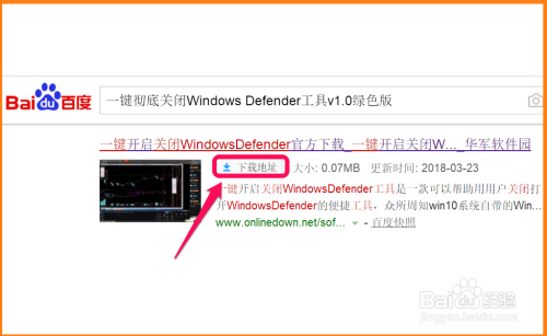 百度搜刮输入:一键彻底封闭Windows Defender东西v1.0绿色版,点击:一键开启封闭Windows Defender官方下载的【下载地址】;