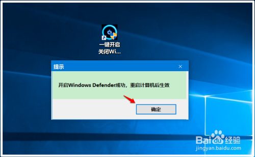 接着也会弹出一个提醒对话框:开启 Windows Defender当作功,重启计较机后生效;点击:确定;